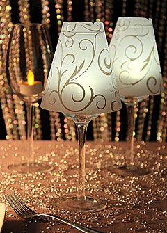 Con ayuda de unas simples copas de cristal, podrás crear unas hermosas lámparas que son perfectas para utilizarse como centros de mesa de una fiesta o celebración. Incluimos un molde al final de esta publicación para elaborar la pantalla de la lámpara. Guarda el molde y amplíalo al tamaño que concuerde con la copa que utilizaras. Úsalo para trazar sobre papel bond o cualquier otro papel que no sea demasiado grueso como para no dejar pasar la luz. Arma la pantalla pegando los extremos y colocándola encima de la copa. Previamente deberás colocar una pequeña vela de té en el interior de la copa. Finalmente, puedes decorar la lampara a tu gusto, poniéndola sobre una base o plato y añadiendo diversos elementos como flores, cuentas, follaje, etc.