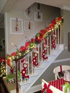 * Utiliza follaje, escarcha o ramas de pino artificiales para cubrir el pasamanos de la escalera. Puedes fijarlo fácilmente usando limpiapipas del mismo tono. Luego añade adornos a tu gusto que puedes fijar de la misma manera.